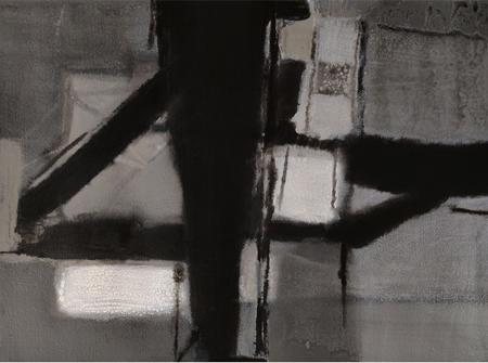Horizontal bands, softened blocks, and interrupted planes suggest landscapes without geography; psychic terrains shaped by pause, erosion, and silence. Malhara’s brushwork avoids emphasis; marks blur into one another, allowing edges to dissolve. This deliberate refusal of sharp definition creates a sense of suspended movement, where forms seem to hover between appearing and disappearing. Blacks carry weight but not aggression, functioning more like anchors of gravity than gestures of dominance.