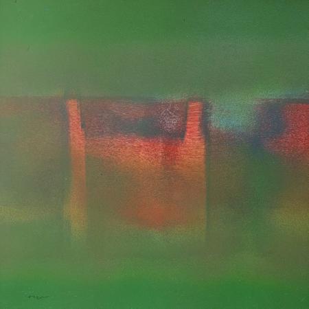 In his works, Hemant Dhane pares abstraction down to its most disciplined, inward essentials. Colour is not applied; it is settled. Greens hover like atmospheric fields, reds burn without aggression, and yellows appear as brief, almost ethical interruptions. The surfaces hold a soft grain, suggesting repeated acts of layering, erasure, and restraint rather than expressive excess.